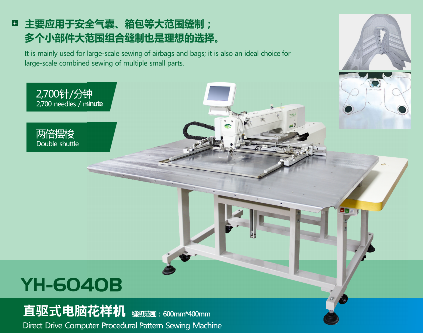主要应用于安全气囊、箱包等大范围缝制;多个小部件大范围组合缝制也是理想的选择。