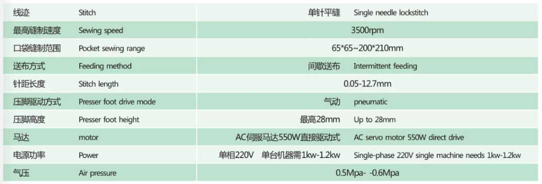 实现口袋一系列工序自动化,在提高生产效率同时,提高品质。